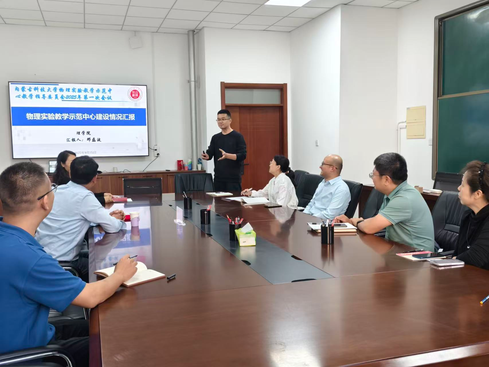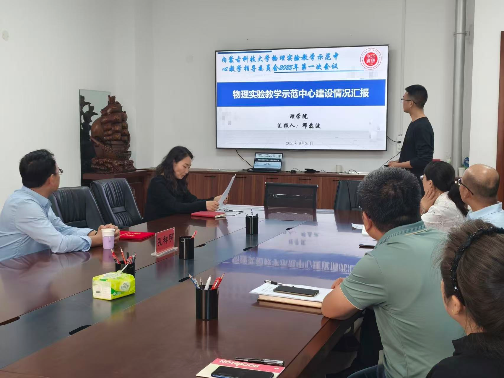 会议首先由物理实验室主任邓磊波向教学指导委员会作示范中心建设情况汇报。邓磊波主任系统汇报了近年来中心在育人理念、教学体系、团队队伍、教学资源、教学改革、示范引领等方面取得的成效,并重点汇报了示范中心在2025年自治区级实验教学示范中心建设成效评估中获得“优秀”的结果。同时,他也客观汇报了评估专家反馈的中心在硬件设施匹配度、团队队伍活力、教学成果凝练、对外交流合作等方面存在的问题与不足。