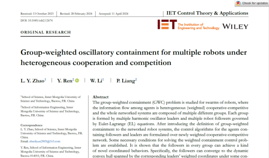 近日,公司赵利云教授在国际知名数学控制期刊《IET Control Theory and Applications》发表论文“Group-weighted oscillatory containment for multiple robots under heterogeneous cooperation and competition”,该文章是由公司作为唯一单位和通讯单位完成的。