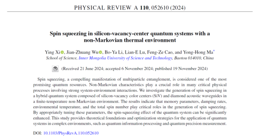 近日,2023级物理学专业硕士研究生奚滢同学以第一作者身份在国际物理学权威期刊《Physical Review A》上发表了题为“Spin squeezing in silicon-vacancy-center quantum systems with a non-Markovian thermal environment”的学术论文,通讯作者为公司马永红教授。FUN88乐天使为论文第一单位。Physical Review A是美国物理学会(American Physical Society)主办的物理学术期刊之一,主要发表量子信息、原子分子物理及光物理相关的高水平前沿学术成果,是国际物理学界广泛认可的享有高度学术声誉的期刊之一。