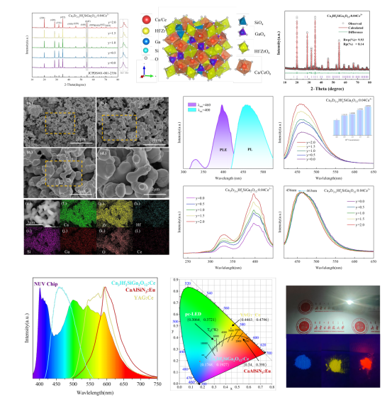 论文提出了一种基于全光谱照明阳离子替换的青色荧光粉,系统研究了其晶体场调控与发光特性。通过Zr/Hf替换优化发光中心Ce³⁺离子晶体场环境,Hf的引入显著提高了荧光粉的结晶性和发光强度,最大发光强度提高了1.9倍,发射光谱出现蓝移现象。并对制备的材料经行能带间隙、温度特性等性能测试,表明部分取代的Ca3ZrHfSiGa2O12:0.04Ce3+表现出最佳热稳定性;并使用400nm芯片配合黄色荧光粉(YAG: Ce3+)和红色荧光粉(CaAlSiN3: Eu2+)制成全光谱光源,在青色荧光粉制备,全光谱照明具有一定的理论和应用价值。