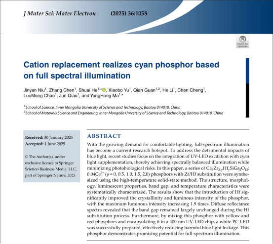 今年,公司在校本科生陈樟在《Journal of Materials Science: Materials in Electronics》(中科院4区,JCR:Q2,影响因子2.779)刊发表了学术论文《Cation Replacement Realizes Cyan Phosphor Based on Full Spectral Illumination》。该研究小组依托公司“稀土发光材料”研究平台,开展了青色石榴石结构荧光材料的设计及其在光学领域的应用研究。