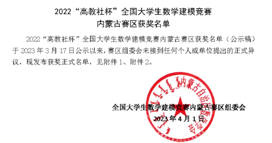 近日,数学建模内蒙古赛区组委会和内蒙古数学学会公布了2022“高教社杯”全国老员工数学建模竞赛成绩,公司学子在数学建模竞赛中取得佳绩。2022年度,公司共培训选派29支参赛队伍,其中,获得内蒙古赛区一等奖2项,赛区二等奖8项,赛区三等奖8项。
